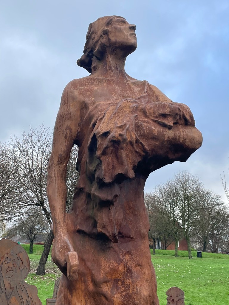 It is fitting that Mary’s sculptor is Luke Perry – who comes from a family of chain workers.  The statue captures Mary cradling a baby in her left arms while holding a hammer in her right.  Her multi-tasking is admirable if a little unsafe….