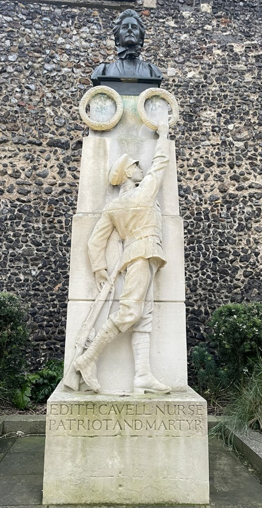 I find her statue positioned against an outer cathedral wall. Sculptured by J.G Gordon, she stands high on a plinth with a soldier reaching up to her with a laurel memorial wreath. This statue was erected in 1918, exactly 3 years after her execution and unveiled by Queen Alexandra. The backdrop of the information stand shows a picture of what looks like thousands of onlookers at the unveiling. The stand also notes a conversation with her friend the night before she was executed, ‘We shall always remember you as a heroine and as a martyr’. To which she replies, ‘Don’t think of me like that – think of me only as a nurse who tried to do her duty.’