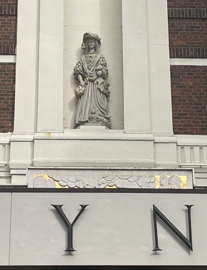 Nell Gwynn stands at – yep – Nell Gwynn House.  She greets the residents from above the impressive entrance; her elevated status making a great photo challenging.