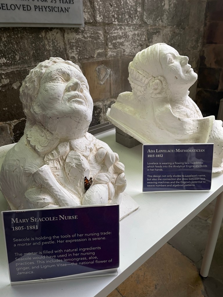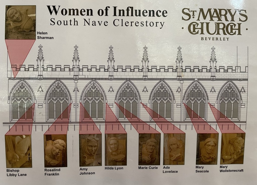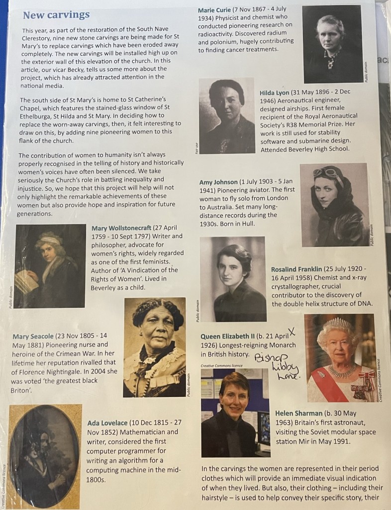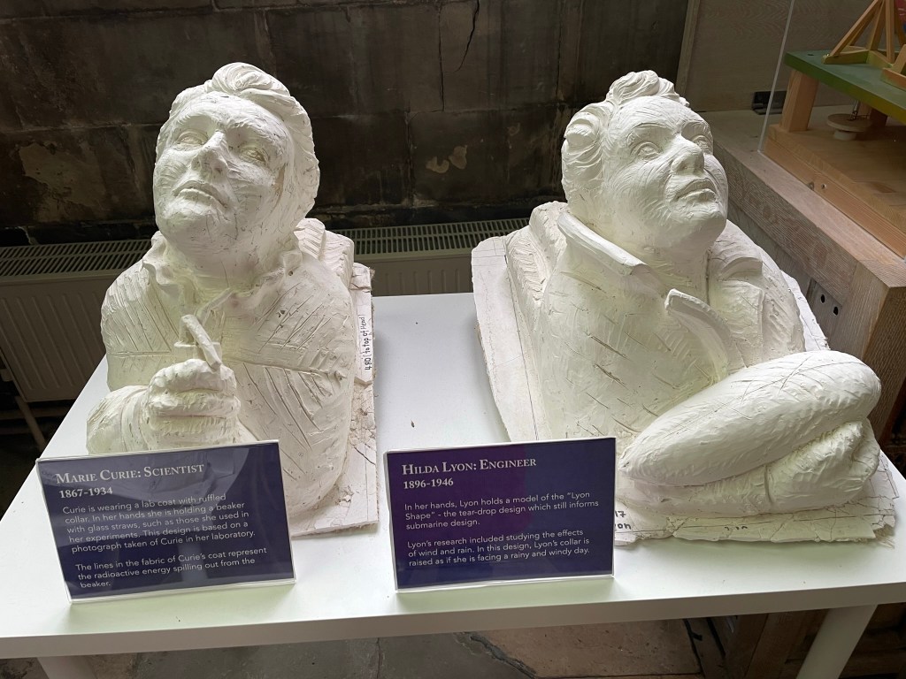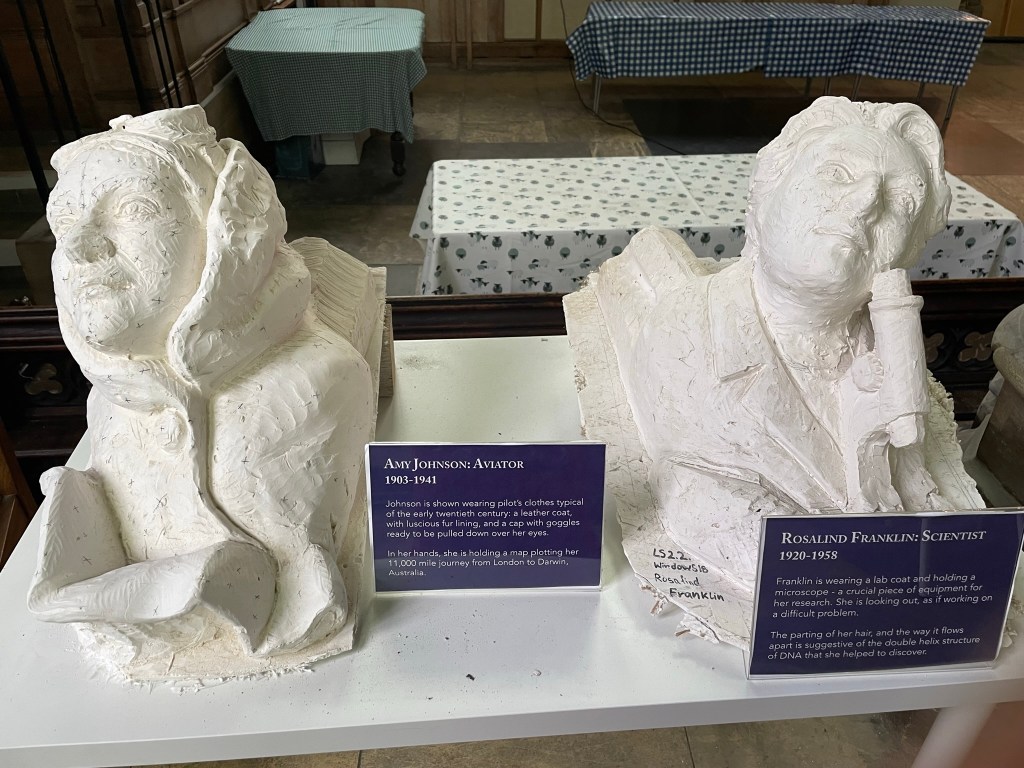 Somewhere, somehow, I hear that a church near the east coast is running a project replacing crumbled stone carvings with new ones, showcasing 9 pioneering women. I could research and write about them myself, but when I arrive an exhibition captures all you need to know…
